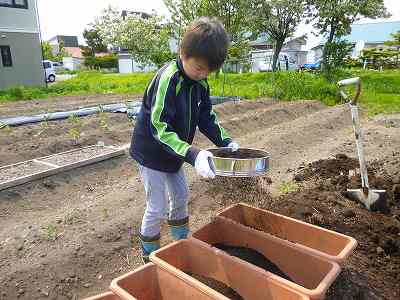 去年使った土をふるいにかける。