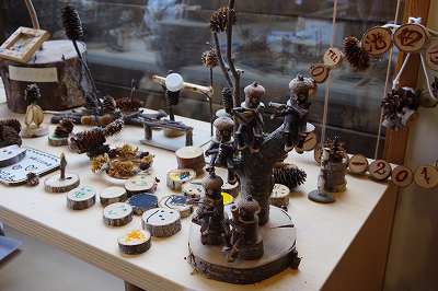 子供たちが使った木の作品がたくさん並んでいるのは